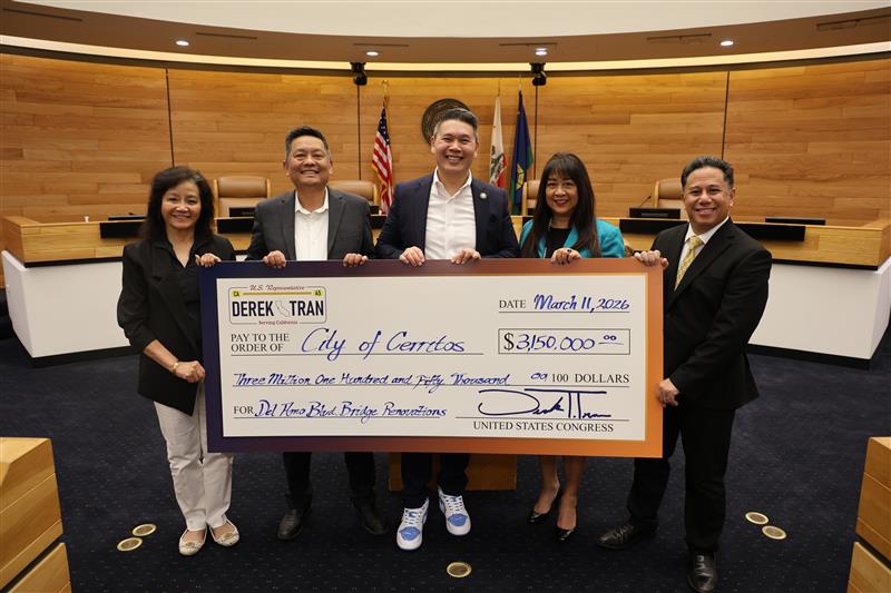 The City of Cerritos appreciates Congressman Tran’s partnership and work on behalf of our community. As the lead agency for the Del Amo Boulevard bridge renovation, the City has also coordinated with the Los Angeles County Metropolitan Transportation Authority, the Orange County Transportation Authority (OCTA), as well as nearby cities, to build regional support. We are grateful for their collaboration and look forward to continued progress toward strengthening our local infrastructure. We also appreciate the public’s support and patience as this project continues to progress.